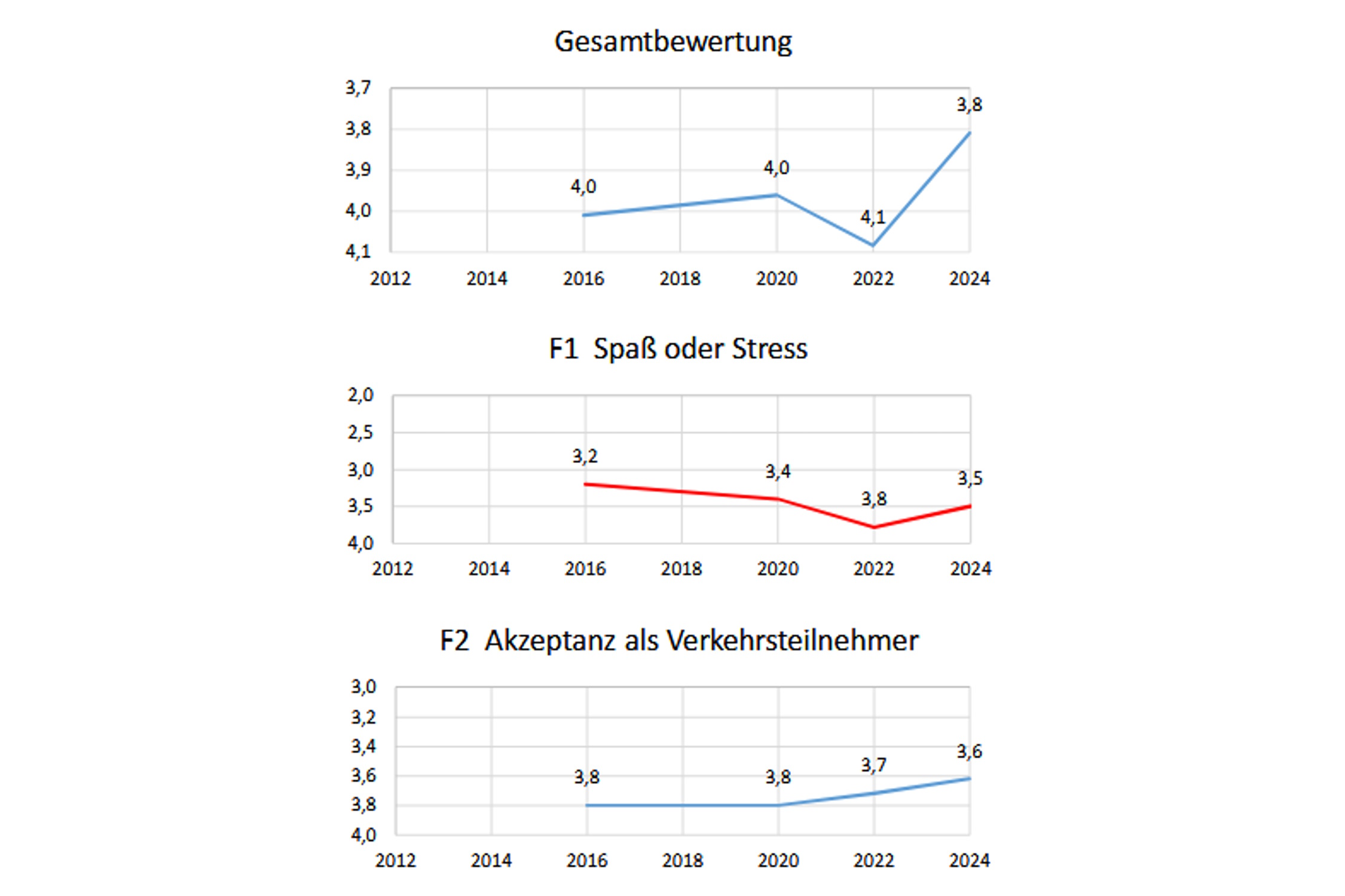 Beim Fahrradklima-Test lag in diesem Jahr ein besonderer Fokus auf dem Miteinander im Straßenverkehr. Neben rücksichtsvollem Verhalten ging es auch darum, ob Autos beim Überholen ausreichend Abstand halten sowie um Konflikte zwischen Radfahrenden. Bei den zusätzlichen Fragen zum Miteinander im Straßenverkehr schneidet Taucha teils deutlich besser ab als der Bundesdurchschnitt.