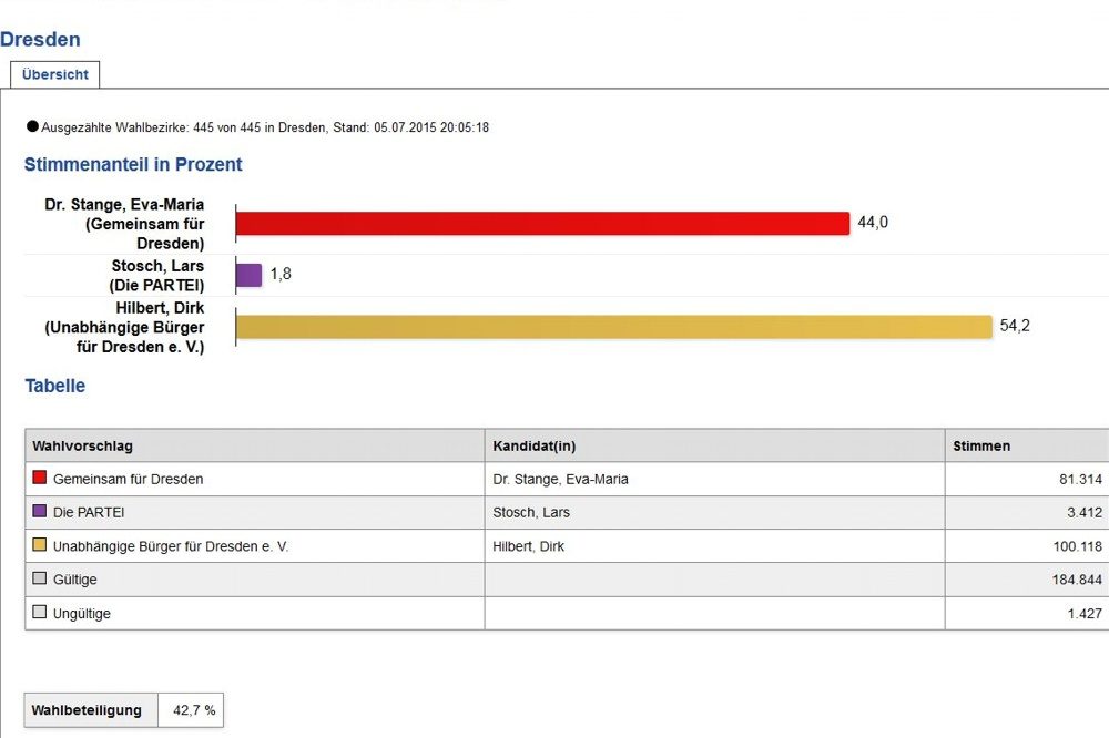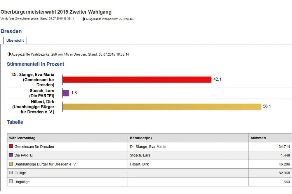 215 Wahlbezirke sind es jetzt, doch der Abstand zwischen den beiden eigentlichen Kandidaten Dr. Eva-Maria Stange und Dirk Hilbert bleibt. Unverändert steht Hilbert (FDP) bei 57 Prozent wie festgenagelt und 41,3 stehen bei Stange (SPD). Der Abstand dürfte zu groß sein, um ihn in der verbleibenden Stadt wettzumachen. Dresden scheint einen liberalen Oberbürgermeister zu wählen.