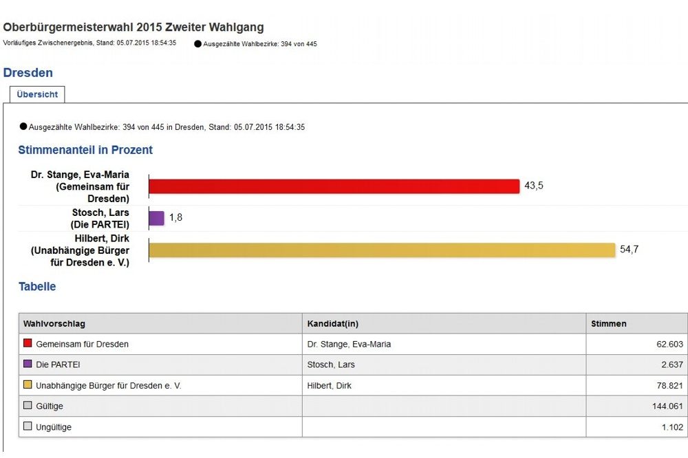 Im ersten Wahlgang am 7. Juni 2015 stimmten 36 %, bei 79.583 Stimmen für Eva-Maria Stange und 31,7 % oder 70.157 Dresdner für Dirk Hilbert. Über 9.000 Stimmen Vorsprung, welche schnell zusammenschmelzen könnten. Denn die Reaktion der weiteren Kandidaten nach dem 7. Juni sprachen alle gegen Stange. Markus Ulbig (15,4 %, CDU), Tatjana Festerling (9,6 %, Pegida) und Stefan Vogel (4,8, AfD) zogen sich zurück und gaben so ein Potential von 65.791 Stimmen rechts von der SPD frei. Und das Lied von der „bürgerlichen Mitte“ erklang, als Innenminister Markus Ulbig seine Wähler um die Stimme für Dirk Hilbert bat.