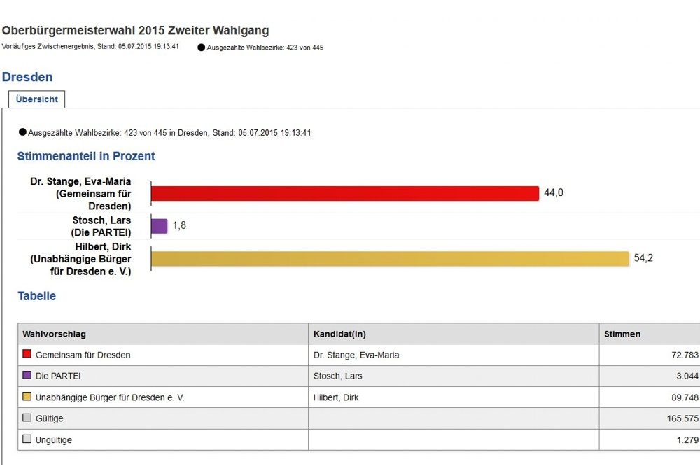 423 Wahlbezirke von 445 sind durch, das Bild bleibt unverändert. Der OBM steht fest, sein Name lautet Dirk Hilbert. Interessant hingegen, wie sich bereits jetzt die reinen Stimmenanzahlen verändert haben. Während Stange, wie prognostiziert, mit derzeit knapp 73.000 Wählern ihr Potential vom ersten Wahlgang (79.583 Stimmen) wohl erneut abrufen konnte, ist der Zuwachs auf Seiten Hilberts dramatisch. Noch kann Stange etwas an Boden gutmachen, denn die Bezirke wurden wieder von “außen” nach “innen”, also Richtung Innenstadt ausgezählt. Doch stimmten am 7. Juni noch insgesamt 70.157 Dresdner für Dirk Hilbert, stehen heute bereits jetzt 20.000 Stimmen mehr bei gesunkener Wahlbeteiligung und noch fehlenden Wahlbezirken.