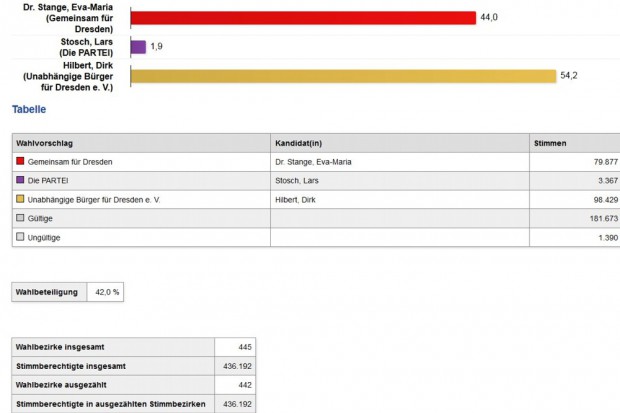 Im Sachsenspiegel kann man sich dann wohl live das enttäuschte Gesicht der amtierenden Staatsministerin Eva-Maria Stange anschauen. Denn heute wird es nichts für die gemeinsame Kandidatin von Rot-Rot-Grün plus Piraten in Dresden. Wie vorausgesagt musste sich der Trend zur ersten Wahl drehen, da alle Kandidaten, welche am 7. Juni noch Hilbert Stimmen kosteten, für den zweiten Gang zurückzogen. Doch nach 394 Wahlbzirken ist klar – Dirk Hilbert (FDP) wird neuer Oberbürgermeister in Dresden.