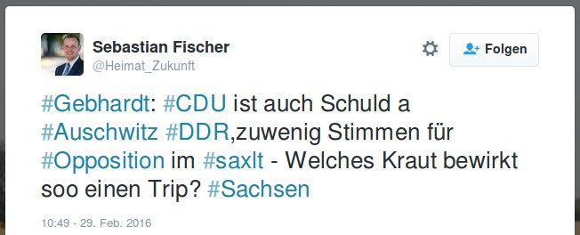 Anlässlich der Vorfälle in Clausnitz und Bautzen traf sich der sächsische Landtag nun am 29. Februar zur Sondersitzung. Thema waren die rechte Gewalt im Freistaat, Gegenstrategien und Erklärungsversuche. Auf Twitter sorgte zeitgleich ein CDU-Landtagsabgeordneter für Verwirrung: Er unterstellte Linke-Fraktionschef Rico Gebhardt, der CDU eine Mitschuld am Holocaust gegeben zu haben.