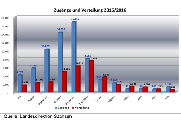 Die Zahlen sprechen für sich: 9.001 Asylbewerber hat Sachsen bis zum 30. Juli aufgenommen. Das waren schon sichtlich weniger als zum selben Zeitpunkt im Vorjahr, als bis zu diesem Zeitpunkt schon 10.498 Asylbewerber gezählt wurden. Die großen Zahlen entstanden ja auch in Sachsen erst im zweiten Halbjahr. Am Jahresende waren dann 69.900 Asylbewerber gezählt worden.
