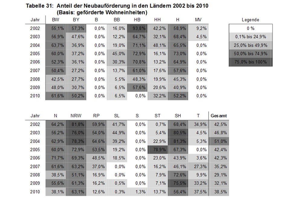 Denn im Ursprungsgesetz ging es eindeutig darum, Wohnraum da zu fördern, wo die Bezahlbarkeit für einkommensschwache Haushalte gesichert werden sollte. Dazu zählte auch die Barrierefreiheit, die mit diesem Geld hergestellt werden kann, um auch einkommensärmeren älteren Mietern barrierefreie Wohnungen anbieten zu können. Dazu zählt auch die energetische Sanierung, damit Wohnungsbestände so energetisch saniert werden können, damit die sozial verträglichen Mieten im Wohngebiet gehalten werden können. Und dass mit dem Programm vor allem der Bau neuer preisgestützter Wohnungen weitergeführt werden sollte, das hatten die meisten Bundesländer auch so gesehen. Bis auf drei: Berlin, Mecklenburg-Vorpommern und Sachsen. Sie schrumpften die Gelder für sozialen Wohnungsbau auf Null, wie in der beigefügten Tabelle zumindest bis zum Jahr 2010 gut zu sehen.