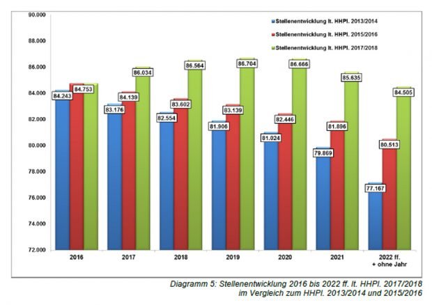 Der zentrale Satz, der die ganze Verärgerung des Finanzminister darüber fasst, dass sein Personalabbauprogramm so jählings gestoppt wurde, steckt in diesem Satz: „Mit dem Doppelhaushalt 2017/2018 hat sich der Bestand an Stellen mit 86.034 in 2017 und 86.564 in 2018 deutlich erhöht.“