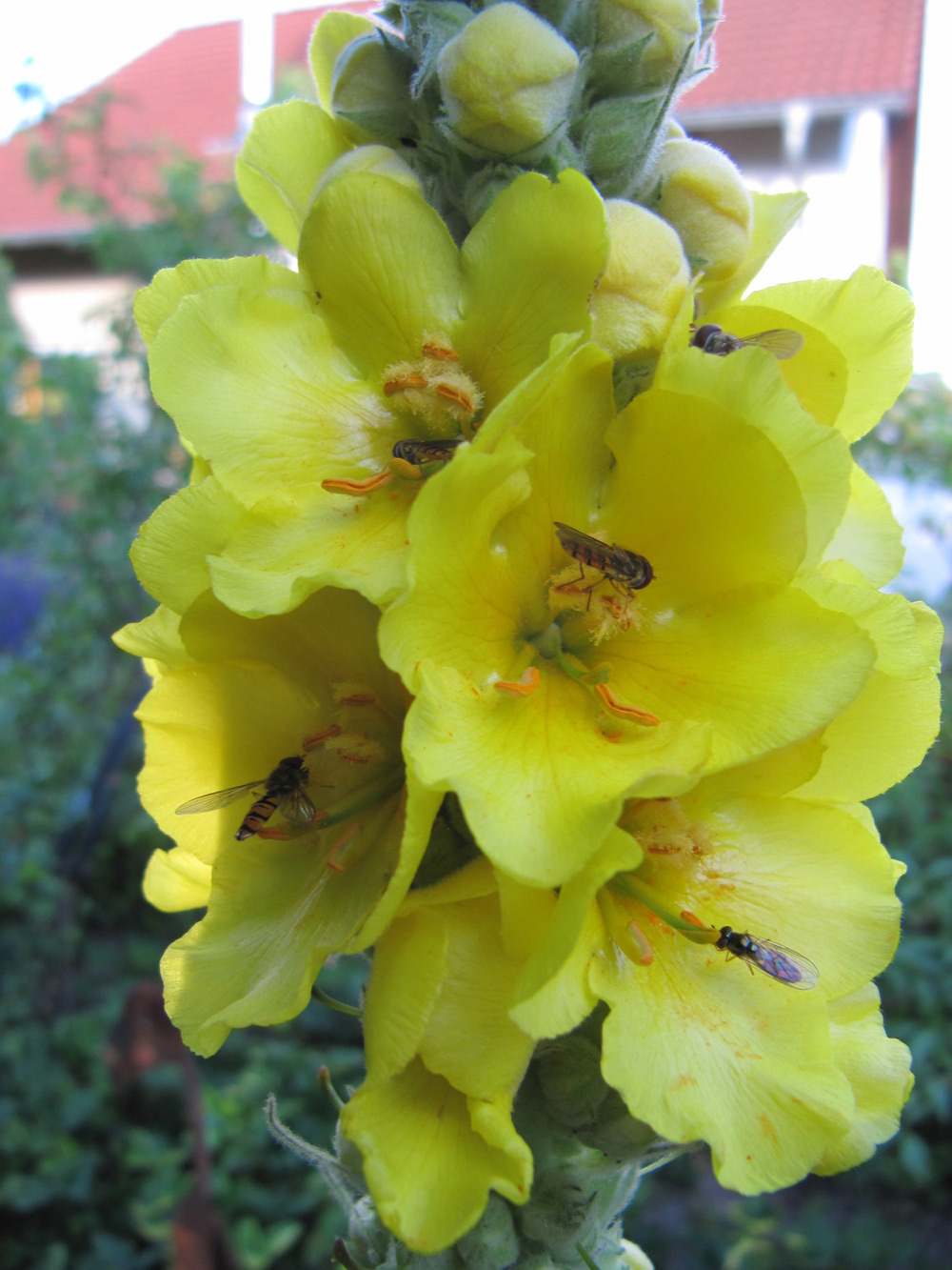 Auch Schwebfliegen bestäuben viele Pflanzen. Hier sieht man Hainschwebfliegen auf einer Königskerze. Foto: Reinart Feldmann / UFZ