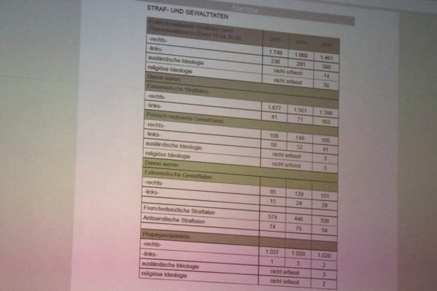 Die Botschaft: die AfD ist das Opfer, die Linksextremen das Problem, Deutschland ist im Ausnahmezustand. Die neue Verfassungsschutzstatistik aus Sachsen 2017 zeige ja auch das eigentliche Problem. Was André Poggenburg dann allerdings kaum lesbar für das Publikum an die Wand wirft, stellt eher das Gegenteil dar: die weit über 1.000 rechtsextremen Propagandadelikte fallen bei ihm rasch unter den Tisch, was zu ersten Widersprüchen der zehn jungen Besucher führt. Dass die rechten Gewalttaten die der (laut Verfassungsschutz) Linksextremen ebenfalls weit übertreffen auch und dass die Zahlen hinter Poggenburg seinen Worten widersprechen, fällt nicht auf.