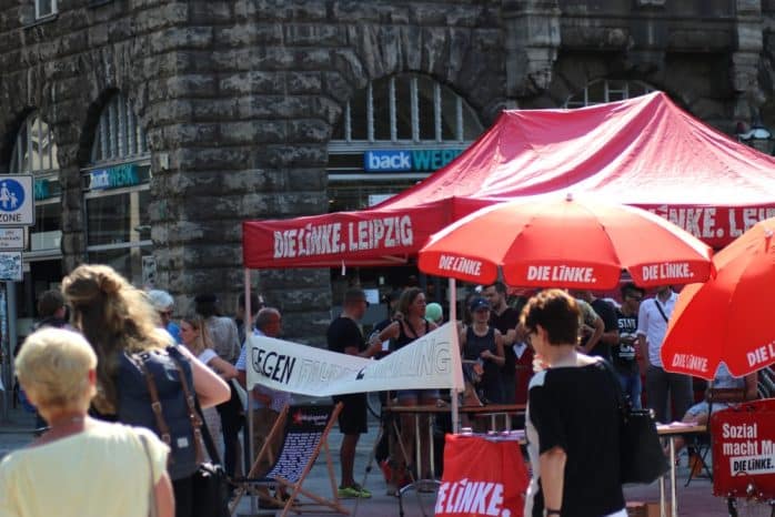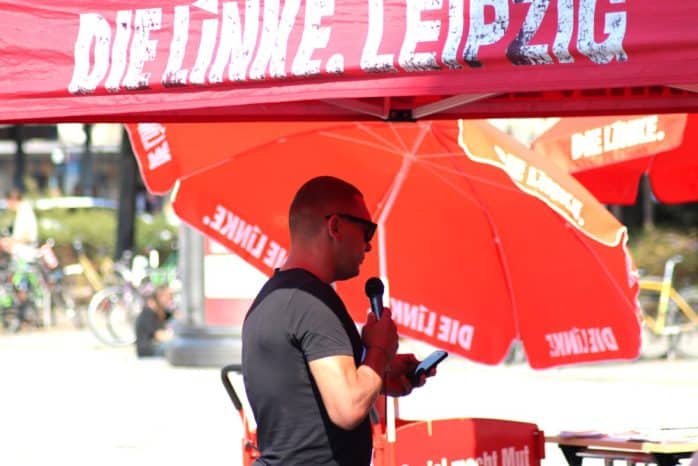 Franziska Riekewald und Marco Böhme (Linkspartei) am 31. Juli auf dem Kleinen Willy-Brandt-Platz. Video L-IZ.de