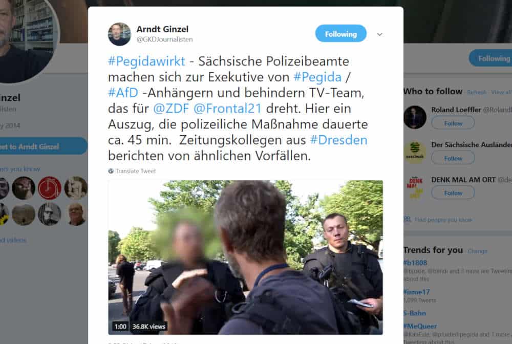 TV-Journalist Arndt Ginzel machte den ungeheuerlichen Vorgang zwei Tage nach dem Geschehen am Samstag publik. Zwei mutmaßliche Neonazis beschimpften seinen Kameramann am Rande der Pegida-Proteste gegen den Besuch von Bundeskanzlerin Angela Merkel (CDU). Die Männer fühlten sich zu Unrecht gefilmt, vermuteten gar eine Straftat. Eine rechtliche Fehleinschätzung.
