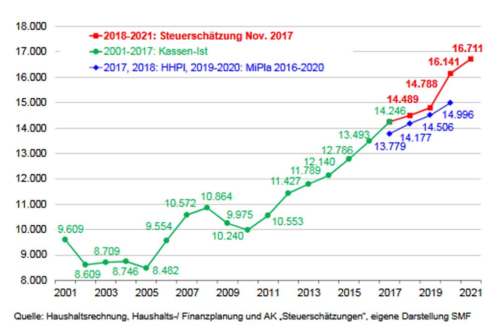 Und wie hoch lagen die? Laut Finanzplanung von 2016 lagen die mal bei 13,914 Milliarden Euro. Immerhin war diese Finanzplanung Grundlage für den Doppelhaushalt 2017/2018, genau dem, dessen zweites Jahr hier abgerechnet wird. Aber wie in allen Vorjahren wurde dann die Steuerprognose jedes Halbe Jahr weiter nach oben korrigiert. Geplant wurde das Haushaltsjahr dann tatsächlich mit 14,177 Millionen Euro. Und nach Aussage von Matthias Haß werden es jetzt also rund 14,8 Milliarden.