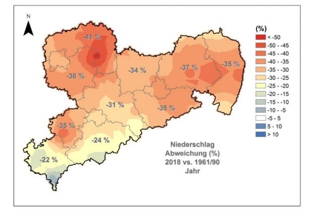 Danach war das Jahr 2018 mit einer Abweichung von +2,2 Grad das wärmste und mit minus 33 Prozent eines der beiden niederschlagsärmsten seit 1881 in Sachsen. Ebenso zählt es mit +31 Prozent zu den beiden sonnenreichsten Jahren seit 1951.