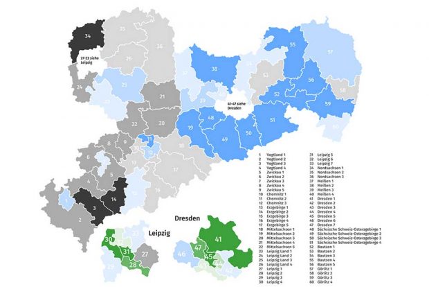 Auf den ersten Blick eine verblüffende Forderung, denn bei der ersten Wahlkreisprognose der Website wahlpreisprognose.de im August vergangenen Jahres war zwar absehbar, dass die CDU den größten Teil ihrer bislang sorgenfrei errungenen Direktmandate verlieren wird, während die AfD in vielen Wahlkreisen gewinnen würde. Lediglich die Linkspartei hätte in Leipzig und Dresden die Chance gehabt, vier Direktmandate zu gewinnen.