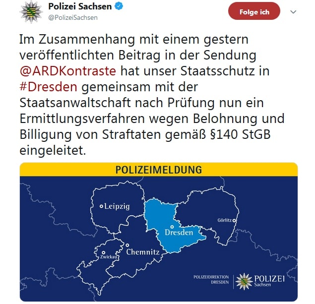 Die Staatsanwaltschaft Dresden hat laut einem Medienbericht Ermittlungen gegen Pegida-Anhänger eingeleitet, die im TV den Mord an Walter Lübcke gebilligt hatten. Laut einem Pressesprecher seien Verfahren wegen Belohnung und Billigung von Straftaten gegen Unbekannt eingeleitet worden. Sachsens SPD-Chef Martin Dulig forderte die Beobachtung von Pegida durch den Verfassungsschutz.
