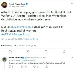 Bemerkenswerter Weise versucht André Poggenburg seiner Demonstration offenbar mit Falschnachrichten via Twitter zu mehr Popularität zu verhelfen. In einem Tweet teilt der Parteichef der ADPM „aktuelle Infos“ mit. „In Leipzig gab es nächtliche Überfälle mit Waffen auf „Rechte“, zudem sollen linke Waffenlager durch Polizei ausgehoben worden sein“, so Poggenburg. Dies sei „Linksterrorismus“, gegen welchen sich der Staat endlich wehren müsse.