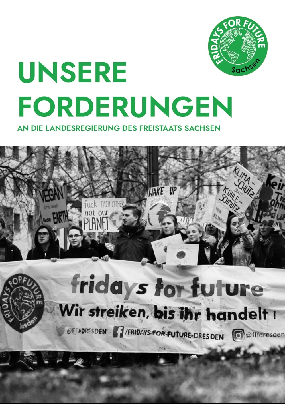 Wir sind Fridays For Future, eine Bewegung, die vor allem von jungen Menschen getragen wird, doch es ist nicht allein die Aufgabe der Jugend, Klimaschutz und Klimagerechtigkeit einzufordern. Es darf nicht allein die Jugend sein, die diese Katastrophe verhindert. Stattdessen sind sämtliche Politiker/-innen und die Regierung des Freistaats Sachsen gefragt.“