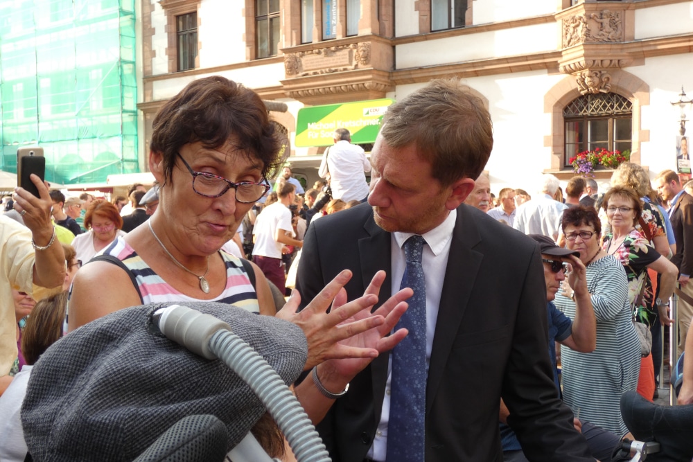 Beim anschließenden „Bad in der Menge“ konnten Besucher ihre Fragen an Kretschmer loswerden – zumindest theoretisch. Doch viele blieben außen vor. Er wolle mal eine Frage stellen, rief ein älterer Herr mit leiser Stimme in Kretschmers Richtung – vergeblich. Stattdessen hörte sich Kretschmer die Probleme einer Gruppe behinderter und offenbar pflegebedürftiger Menschen an, händigte am Ende seine Mailadresse aus. Man werde sich kümmern, versprach er.