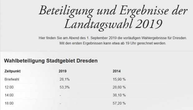 Die vorläufige Wahlbeteiligung war um 14 Uhr auf Landesebene ebenfalls deutlich höher als vor 5 Jahren. Wie die Landeswahlleiterin Frau Carolin Schreck mitteilt, lag „die Wahlbeteiligung im Freistaat Sachsen um 12 Uhr bei 26,2 Prozent und um 14 Uhr bei 35,1 Prozent. Zur Landtagswahl 2014 lag die Wahlbeteiligung um 12 Uhr bei 14,9 Prozent, 14 Uhr bei 23,1 Prozent.“