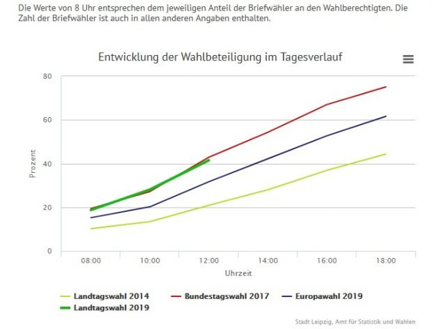 Um 14 Uhr beträgt die Wahlbeteiligung in Leipzig 49,5 Prozent. Sie liegt damit mehr als 20 Prozentpunkte über dem Wert von 2014 zur gleichen Zeit und bereits mehr als fünf Prozentpunkte über der gesamten Wahlbeteiligung vor fünf Jahren.