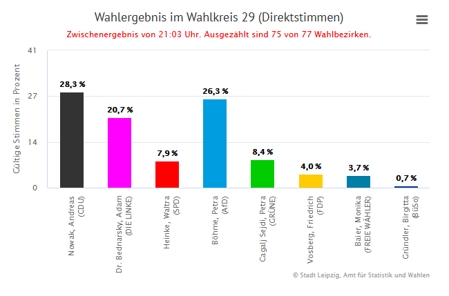 Das ging überraschend flott im Vergleich zur Kommunal- und Europawahl. Die Auszählungen schreiten rasend schnell voran. Im ganz äußeren Leipziger Osten (WK 27) ist es Roland Pohle, der nach 63 von 79 auszuzählenden Wahllokalen enteilt sein dürfte. Der CDU-Landtagsabgeordnete hat es erneut geschafft und steht mittlerweile bei 31,8 % der Direktstimmen. Nur Kerstin Penndorf (AfD) kann hier noch mit 22 % einigermaßen mithalten, ist aber bereits zu weit auf Abstand.