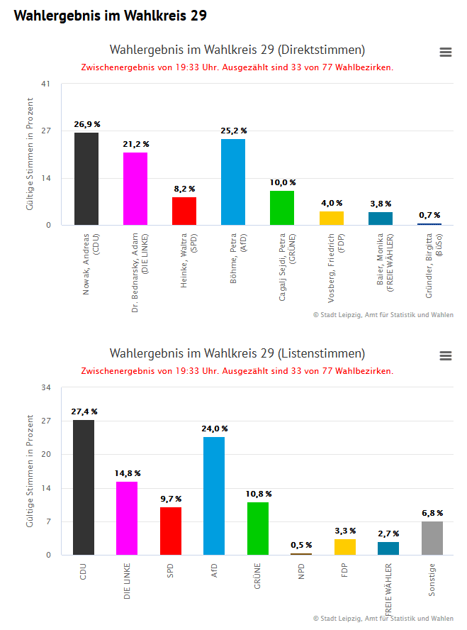 Aus Leipzig gibt es noch keine verwertbaren Ergebnisse. Diese werden hier auf Leipzig.de und hier auf L-IZ.de veröffentlicht.