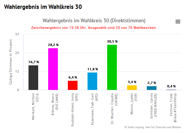 Bereits vor der Hälfte aller gezählten Wahllokale (hier also 30 von 76) kann man wohl den Zweikampf zwischen Claudia Maicher (MdL, Grüne) und Marco Böhme (MdL, Linke) schon ganz gut sehen. Überraschend früh auf Abstand geraten sind hier Irena Rudolph-Kokot (SPD) und Michael Weickert (CDU). Wenn man bei Kokot noch auf die schwache SPD schauen kann und hierin einige Begründungen findet, hat Weickert vom CDU-Wahlkampf um Michael Kretschmer offenkundig nicht partizipiert.