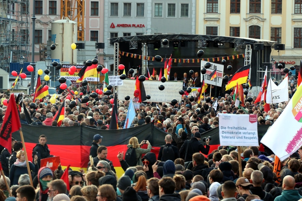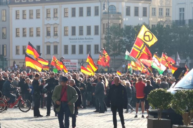 Auf der einen Seite des Dresdner Neumarktes stehen heute „Herz statt Hetze“, „Leipzig nimmt Platz“, „Chemnitz nazifrei“ und zahlreiche Dresdner, Initiativen und Vereinigungen, die lautstark gegen Pegida demonstrieren. Auf der anderen Pegida selbst, welche für ihr Zusammenkommen unzählige rechtsradikale Redner aus halb Europa eingeladen haben. Mit dabei neben Lutz Bachmann selbst also Michael Stürzenberger (Pax Europa), Martin Sellner (Identitäre Bewegung). Gegen Bachmann ermittelt aktuell der Staatsschutz, Sellners „Identitäre“ werden vom Verfassungsschutz beobachtet und Stürzenberger wird im November versuchen, eine achtmonatige Bewährungsstrafe gegen sich abzuwehren.