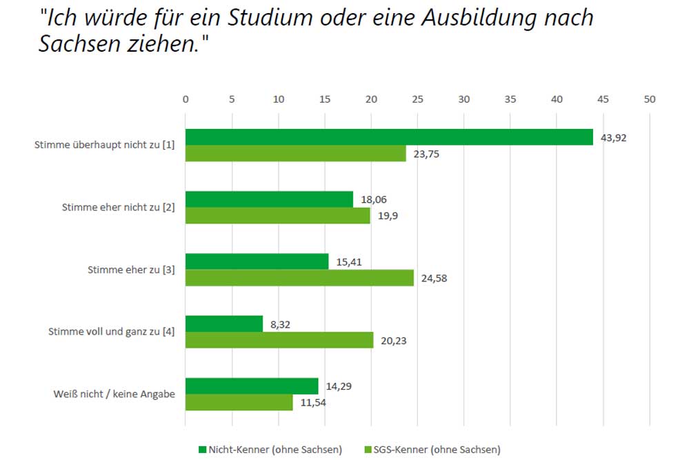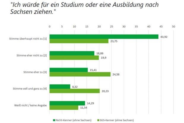 So ähnlich ist es bei der Frage, ob sich die Befragten vorstellen können, zu Studium und Ausbildung nach Sachsen zu ziehen. Hier liegt die Ablehnung bei jenen, die „So geht sächsisch“ nicht kennen, bei 62 Prozent. Bei denen, die die Kampagne kennen, sinkt der Wert auf 44 Prozent. In gewisser Weise wirkt die Kampagne tatsächlich so, dass sie für Menschen, die Sachsen noch nicht kennen, auch einmal Dinge zeigt, die das Bundesland attraktiv machen.
