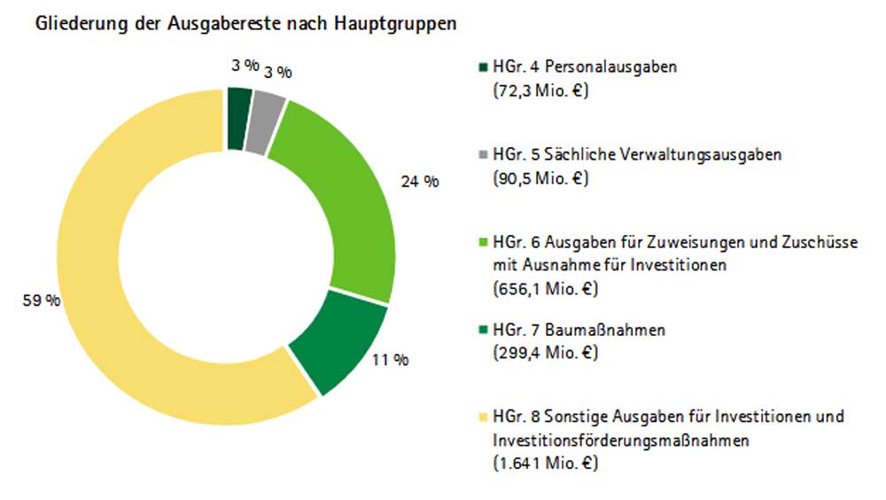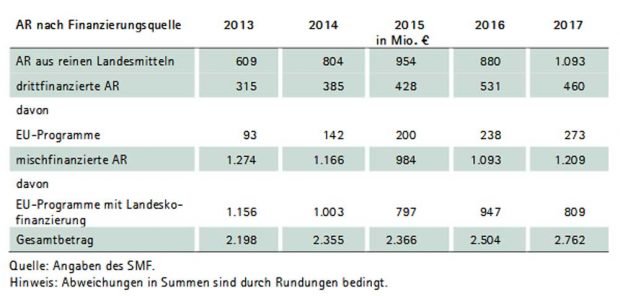 Der Rechnungshofbericht widmet diesen Ausgaberesten ein recht ausführliches Kapitel. Darin wundern sich die Rechnungsprüfer ebenfalls darüber, dass die Mittel für Straßenbau nicht abgerufen wurden: „Zwischen 2016 und 2017 ist ein auffällig hoher Anstieg an AR u. a. bei der Förderung des kommunalen Straßen- und Brückenbaus aus dem Epl. 07 (Kap. 0706, Tit. 883 15) von rd. 10 T€ auf rd. 35,6 Mio. € (+35,6 Mio. €) und bei Zuschüssen für die Wohnraumförderung aus dem Epl. 03 (Kap. 0323, Tit. 893 92) von rd. 32,6 Mio. € auf rd. 104,7 Mio. € (+72,1 Mio. €) zu verzeichnen.“