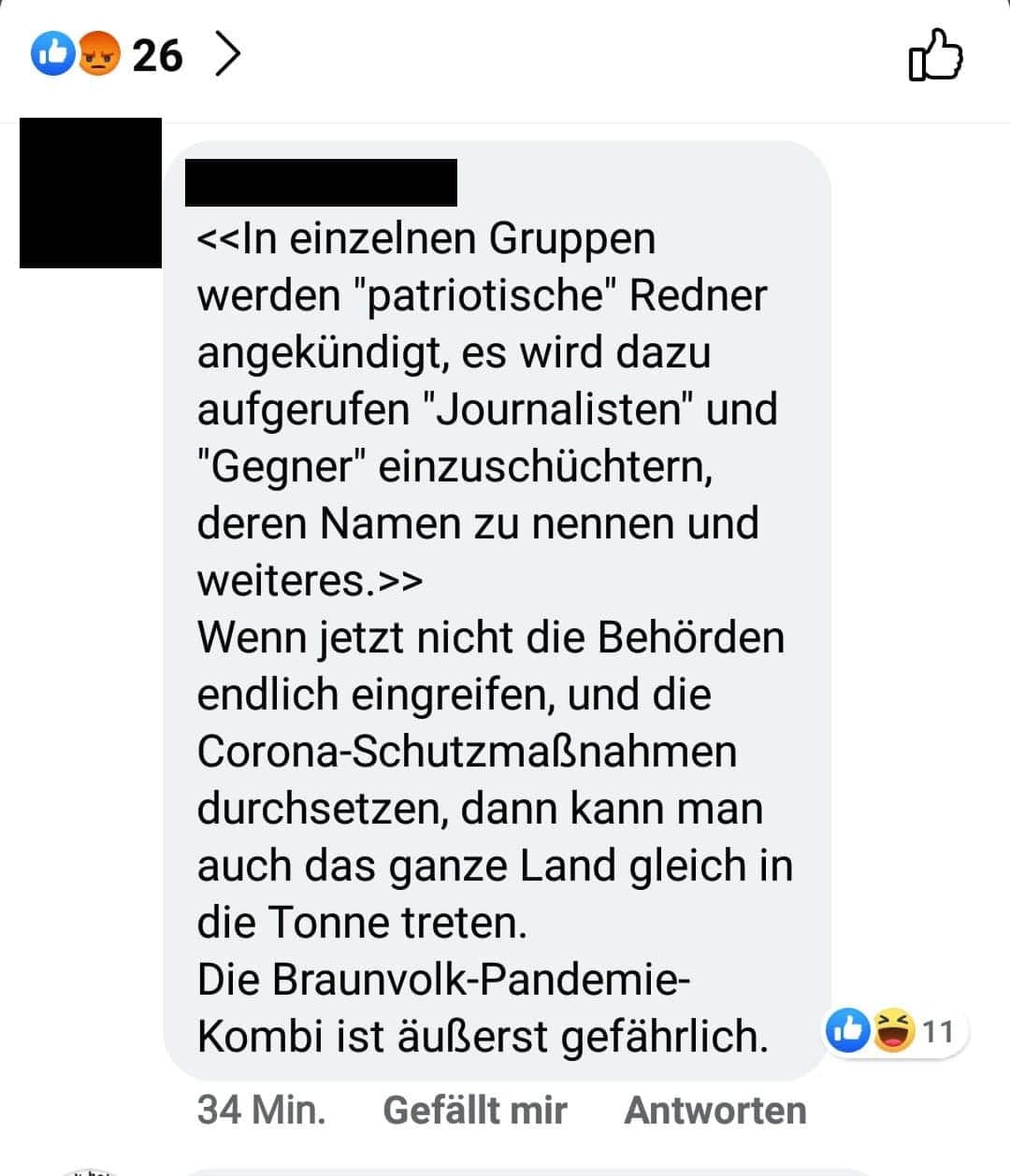 Während den zivilgesellschaftlichen Initiativen wie „Leipzig nimmt Platz“ und anderen durch die Pandemie zumindest teilweise bei der Organisation einer Massen-Gegendemo am 7. November durch Corona-Vorschriften und Vernunft die Hände gebunden sind, steigt die Gefahr auch einer Radikalisierung im gewaltbereiten, linksextremen Spektrum.