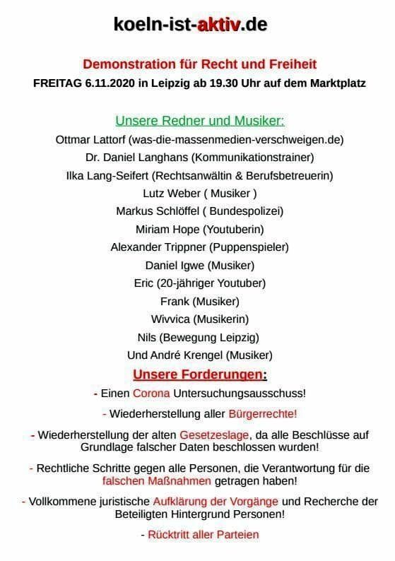 Dann geht es um Forderungen wie „Rücktritt aller Parteien“, Rücknahme aller getroffenen Corona-Schutzmaßnahmen und die juristische Verfolgen aller, die in den vergangenen acht Monaten Entscheidungen zur Covid19-Abwehr treffen mussten. Am Samstag möchte man sich dann zu einem Fahrzeug-Corso im Leipziger Westen treffen, um gemeinsam zur großen Partysause mit Musik ab 13 Uhr auf dem Augustplatz zu fahren.