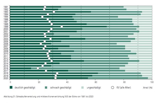 „Das absolute Minimum mit 19,6 Prozent wurde im Jahr 2016 festgestellt. Aktuell ging die Häufigkeit der Bäume ohne Schadsymptome um weitere vier Prozentpunkte auf nur noch 3 Prozent zurück. Aber auch der Anteil der deutlich geschädigten Individuen sank wie schon 2018 zu 2019 von 62 Prozent auf 58 Prozent und nunmehr auf 55 Prozent.“