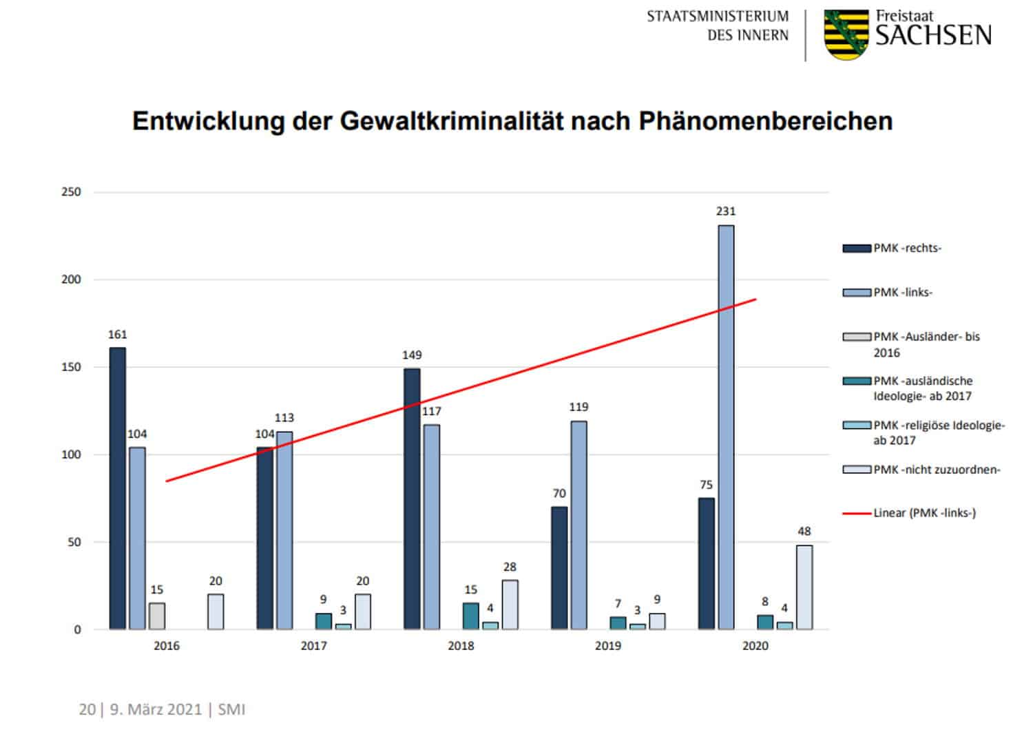 Und der Artikel glänzt ja auch mit dem Satz: „Im vergangenen Jahr wurden linksextremen Gewalttätern in Sachsen 231 Straftaten zugeordnet, auf der rechten Gegenseite waren es 75.“ Was ja auch in der vom Innenministerium zur sächsischen Kriminalitätsstatistik 2020 erstellten Grafik beeindruckend aussieht: Die Rechten werden immer harmloser, die Linken immer gewalttätiger. Das ist ja auch Münsters Erzählung.