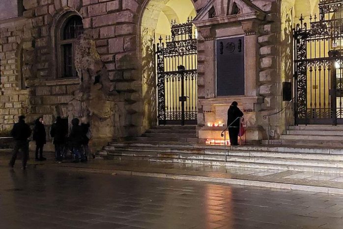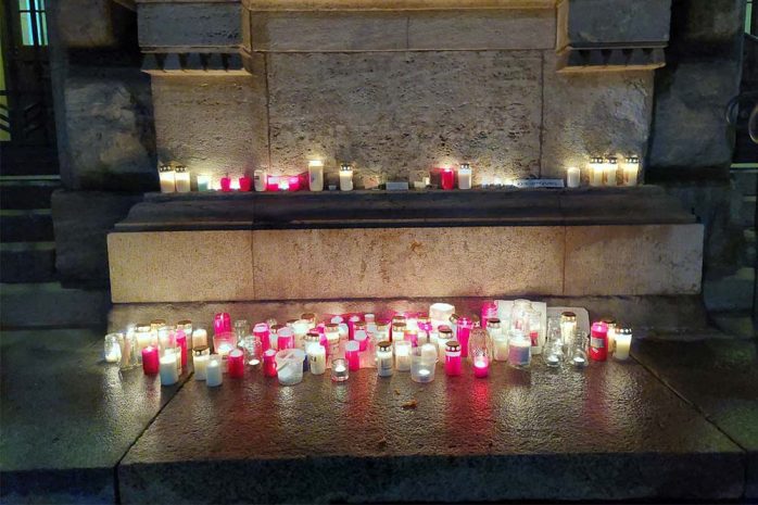 Wie neben den Neonazis um Martin Kohlmann (Pro Chemnitz) und NPD-Kader Stefan Hartung („Freie Sachsen“) auch bei der eher verschwörungsesoterisch getriebenen „Bewegung Leipzig“ wortgleich angekündigt, hatten sie Kerzen dabei und platzierten sie nach ihrer Entzündung vor dem Gebäudeeingang. Der Sinn der Illumination laut der Chemnitzer „Freien Sachsen“: „Zeigen wir, wieviele Menschen es gibt, die sich keiner Impfpflicht unterwerfen wollen.“ (Fehler im Original)