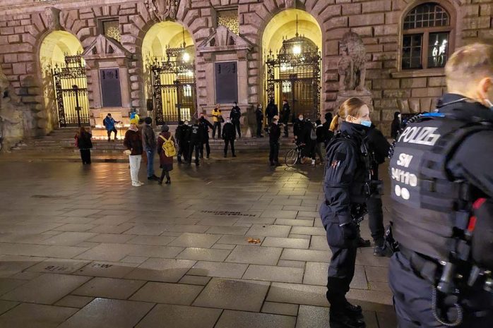 10 Personen sind erlaubt. Es sind mehr als 10. Aber macht ja nix, die Polizei, der Freund und Helfer der Beschränkt-Denker. Kerzchen (geht’s noch ne Nummer pathetischer?) sollen nicht ausgepustet werden. Lächerlich!