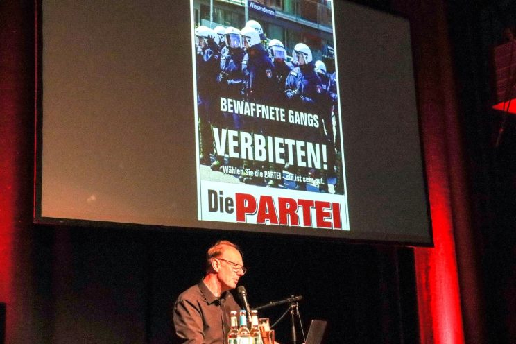 Kaum eine Partei kennt derart glühende Anhänger, wie die gern als Satire-Partei bezeichnete „Partei für Arbeit, Rechtsstaat, Tierschutz, Elitenförderung und basisdemokratische Initiative“, kurz Die PARTEI. Ein Zeichen dafür: Während andere kostenfrei auf Marktplätzen für sich werben, verkaufte ihr Partei-Vorsitzender Martin Sonneborn die rund 500 Sitzplätze im Werk 2, Halle A Ende Mai 2022 über die Pandemie hinweg gleich an zwei Terminen nacheinander restlos.