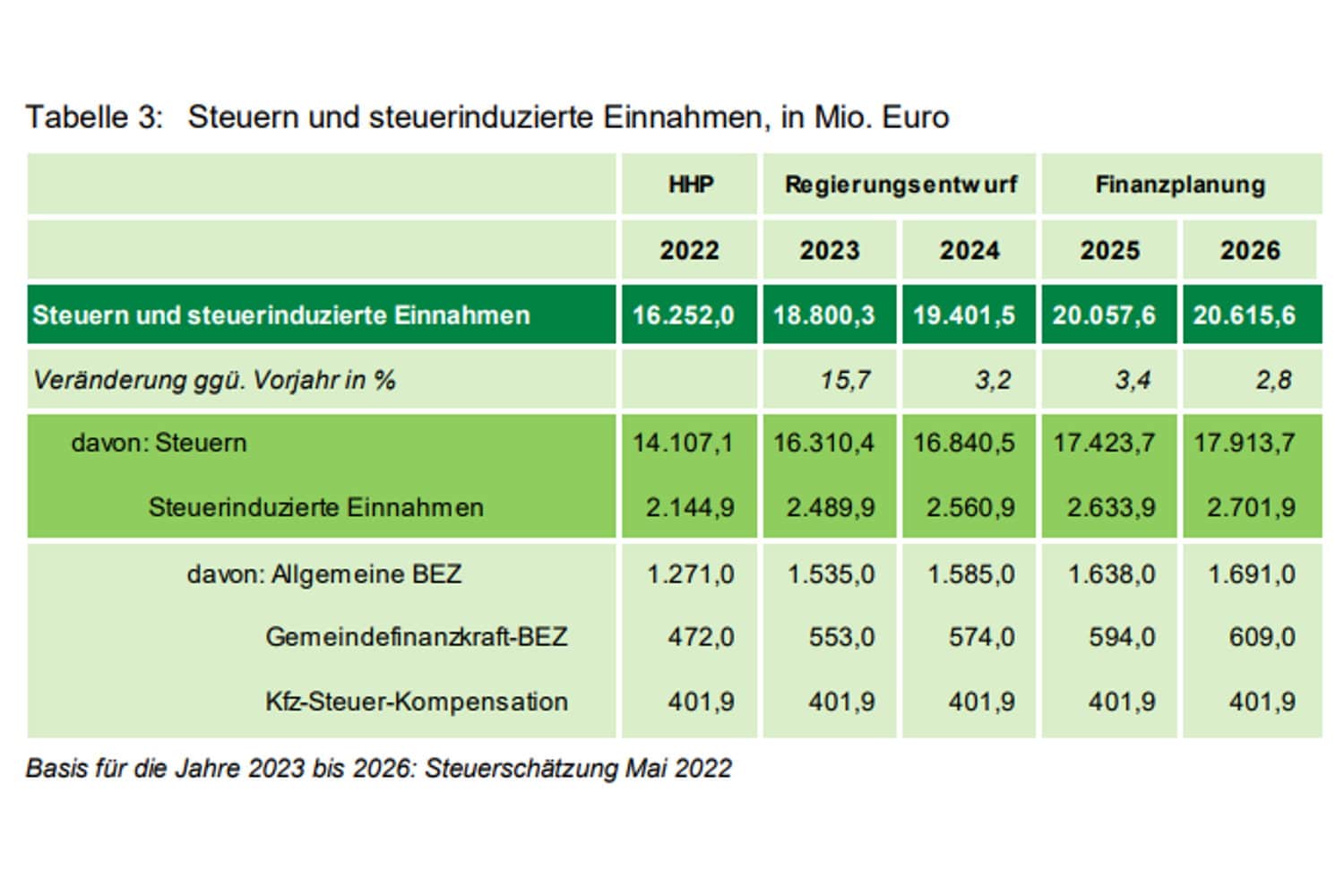 Für die Jahre 2023 und 2024 belaufen sich die Einnahmeerwartungen bei den Steuern auf rund 4,5 Milliarden Euro bzw. 4,7 Milliarden Euro. Im Zeitraum von 2022 bis 2024 belaufen sich die Mehreinnahmen der Kommunen auf insgesamt rund 400 Millionen Euro.