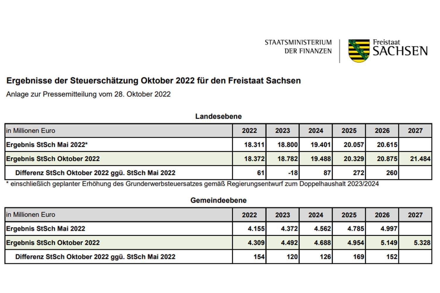 Für Sachsen ergab das Ergebnis der Oktober-Steuerschätzung 2022 im Jahr 2022 absehbare Steuereinnahmen von rund 18,4 Milliarden Euro. Für die Jahre 2023 und 2024 werden rund 18,8 Milliarden bzw. 19,5 Milliarden Euro prognostiziert.
