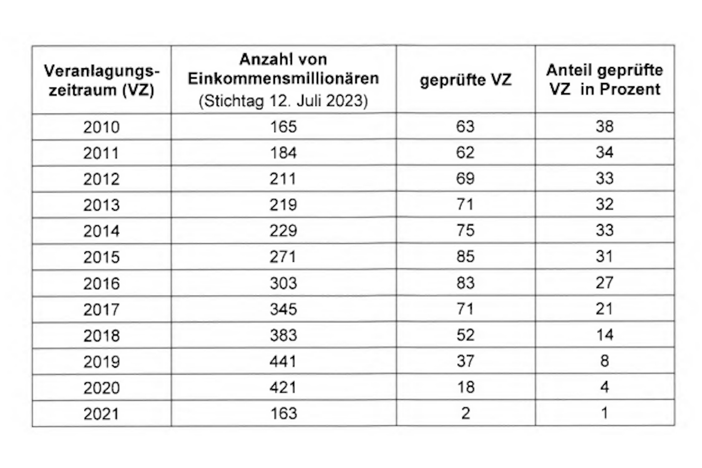 Wobei das eben alles nur generalisierte Zahlen sind. Und unvollständige sowieso, da nicht alle Millionäre jedes Jahr einer Prüfung unterliegen und viele Prüfungen seit 2020 noch nicht abgeschlossen sind.