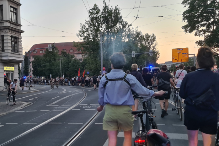 An diesem Abend sind in Leipzig mehrere antifaschistische Demonstrationen unterwegs. Eine davon ist vom Rabet Richtung Innenstadt gestartet. Etwa 600 Personen beteiligen sich daran.