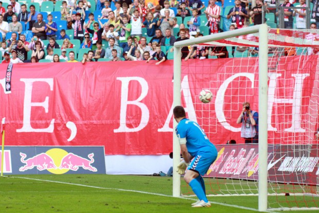 Minuten später probierte der RB-Kapitän sein Glück aus der Distanz. Hesl fischte den Ball aus der Luft (30.). Poulsen jagte samt Ball bei einem Gegenstoß rasant über den halben Platz. Vor dem Fürther Strafraum fand der Angreifer Forsberg, der zurück auf Poulsen passte – und weg war der Ball. Sah trotzdem schön aus (42.). Elegant war dagegen Kaisers unhaltbarer Freistoß kurz vor dem Pausenpfiff. Hesl sah den Ball viel zu spät anrauschen und bewegte sich keinen Zentimeter vom Fleck (45.).