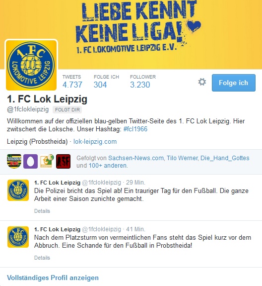 Der 1. FC Lokomotive ist immer wieder in die Öffentlichkeit geraten, weil es zu Vorfällen im Stadion kam. Unter dem neuen und nun scheidenden Präsidenten Heiko Spauke wurde das Problem sichtbar kleiner – nun ist es wieder da. Geradezu fassungslos der Eintrag des Twitterteams von Lok, als sich in Erfurt die Szenen abspielten: “Eine Schande für den Fußball in Probstheida” und “Die Polizei bricht das Spiel ab! Ein trauriger Tag für den Fußball. Die ganze Arbeit einer Saison zunichte gemacht.” kann man da zum Spielabbruch lesen. Wie groß die Gruppe der Platzstürmer war, ist derzeit unklar.