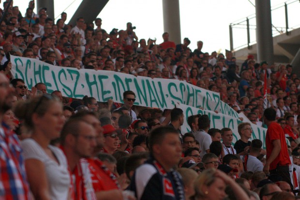 Mitglieder der Ultragruppierung Red Aces wollten beispielsweise während des ersten Heimspiels der laufenden Zweitligasaison ein Banner mit der Aufschrift “Ligaspiel und Legida – der Montag ist zum Kotzen da” vorzeigen. Der Verein untersagte dies. Beim folgenden Heimspiel wurde er deshalb vorab gar nicht erst um Erlaubnis gefragt. Stattdessen schmuggelten die Fans zum Spiel gegen St. Pauli ein Spruchband ins Stadion, das den derzeit tobenden Rechtsterror thematisierte: “Scheiß Heidenau, Scheiß Sachsen, Scheiß Nazis!” war darauf zu lesen.