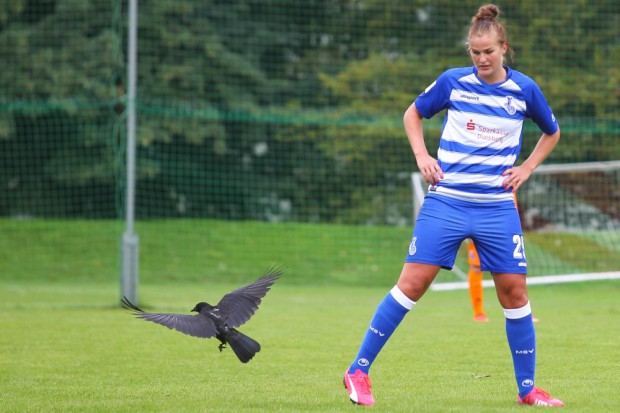 Die zweite Halbzeit knüpfte nahtlos an die erste an: Duisburg am Drücker, Leipzig kämpferisch. Es war noch keine Viertelstunde im zweiten Abschnitt gespielt, als sich mitten auf dem Spielfeld eine Krähe niederließ und unbeeindruckt vom sportlichen Getümmel nach kulinarischen Köstlichkeiten pickte. Doch der schwarze Vogel schien den Gastgeberinnen Pech mitgebracht zu haben.