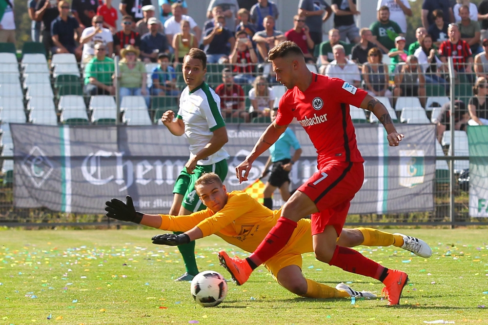 Der erste Treffer war trotzdem den Gästen vorbehalten. Nach einer Ecke verlängerte Danny Blum per Kopf auf den frei vor dem Tor stehenden Alexander Meier, der sich das 0:1 nicht nehmen ließ (32.). Das schien die Chemiker aufgeweckt zu haben, denn ihre Angriffe wurden nun zwingender. Nachdem Florian Schmidt (41.) und Nicolas Ludwig (44.) den Eintracht Keeper Heinz Lindner bereits zu Glanztaten gezwungen hatten, gelang Schmidt unmittelbar vor dem Pausenpfiff tatsächlich der 1:1-Ausgleich.