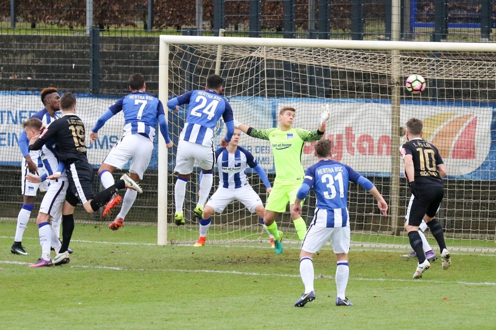 Sowohl im ersten als auch im zweiten Abschnitt waren die Gastgeber technisch das bessere Team und versuchten ein hohes Spieltempo anzuschlagen. Am Ende sprang allerdings nur ein einziges Tor heraus. Der wieder mal blasse Georgi wollte einen Einwurf rausholen, ließ sich aber von U20-Nationalspieler Mittelstädt überrumpeln, dessen Flanke köpfte Fabian Eisele ins Tor. Der Anschluss für die Hertha nach 51 Minuten und das Fanal zu einer kuriosen zweiten Halbzeit.