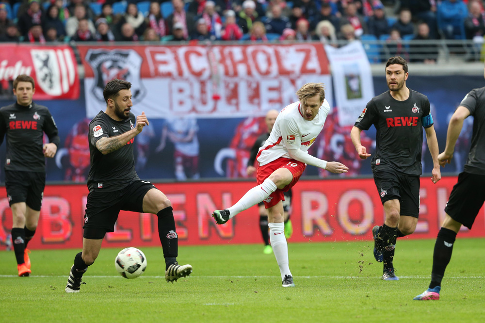 Es dauerte nur fünf Minuten, da stand es bereits 1:0. Kölns Torwart Kessler hatte den Ball zu kurz nach vorn geschlagen, direkt auf den Kopf von Werner. Von dort kam der Ball zu Forsberg, der Kölns Verteidiger Maroh umkurvte und aus zehn Metern links unten einschob. Als Werner zwei Minuten später allein Richtung Gästetor unterwegs war, wegen eines Hackentritts von Maroh jedoch zu Fall kam, sah es so aus, als könnte es wie schon gegen Frankfurt nach wenigen Minuten einen Platzverweis geben. Schiedsrichter Marco Fritz entschied sich jedoch lediglich für eine Gelbe Karte, da Torwart Kessler den langen Pass wohl zuerst erreicht hätte.