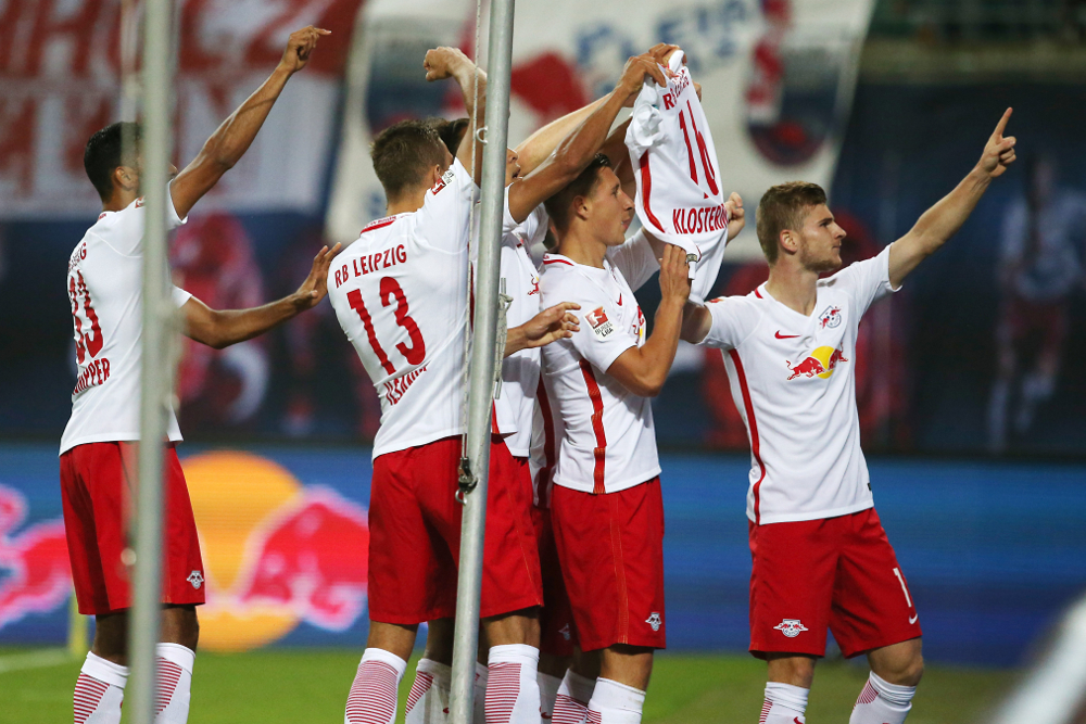 Den 1:0-Treffer im Hinspiel widmeten die Leipziger dem Langzeitverletzten Klostermann. Foto: GEPA
