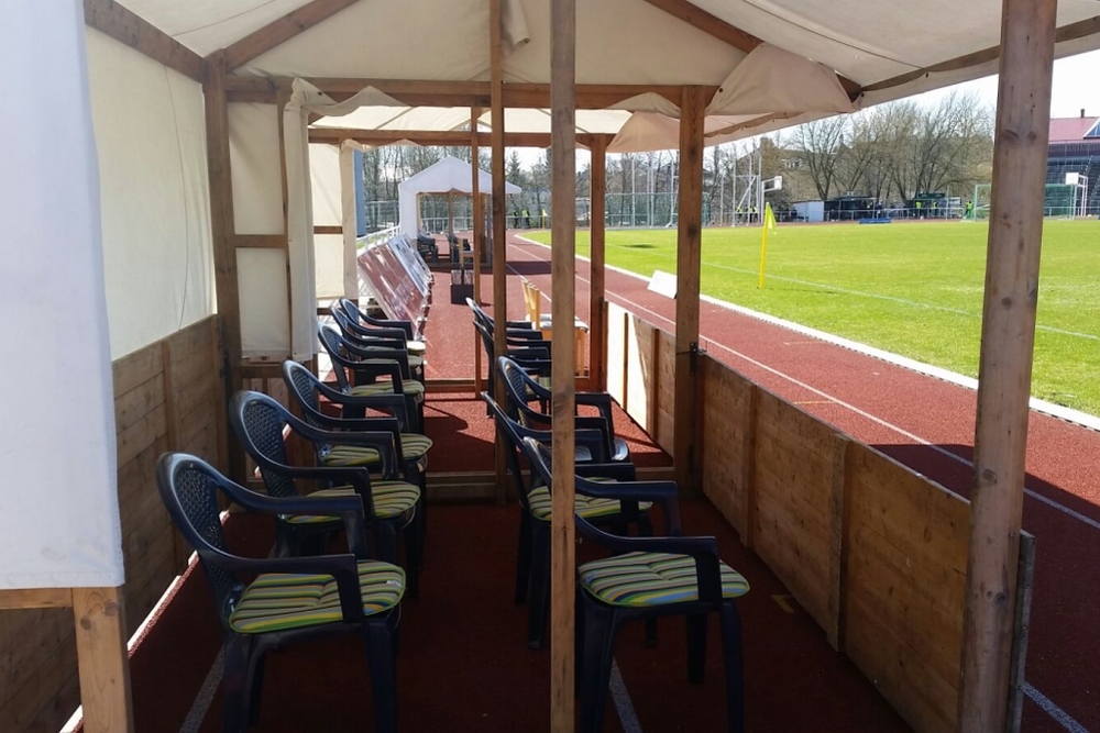 Im Stadion gibt es keine festinstallierten Sicherheitszäune, die Treppen und Borten stehen schief und sind unterschiedlich hoch, der Handlauf rund ums Spielfeld ist eine schöne Zierde – mehr nicht. Da waren die Trainerbänke, die aus zwei Festzelten und mehreren Gartenstühlen bestanden (mit Sitzkissen) noch eine lustige Randerscheinung.