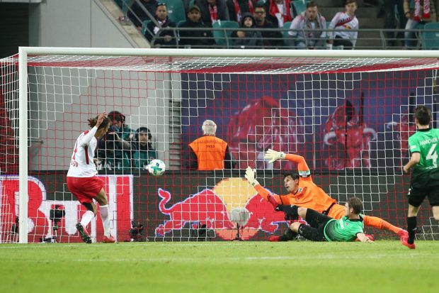 Fast im Gegenzug kam Klaus nach einer flachen Hereingabe von Bebou zentral zum Abschluss, wurde jedoch entscheidend gestört, so dass Gulacsi keine Mühe hatte, den Ball zu halten. Kurz vor der Pause dann die größte Chance der ersten Halbzeit: Werner schoss den Ball aus kurzer Distanz an die Latte.