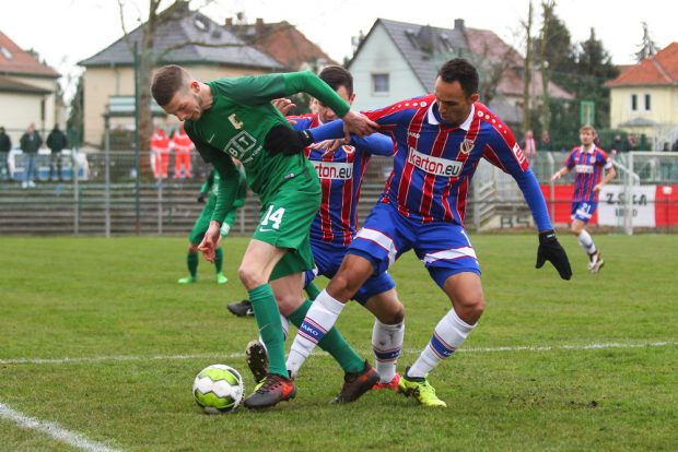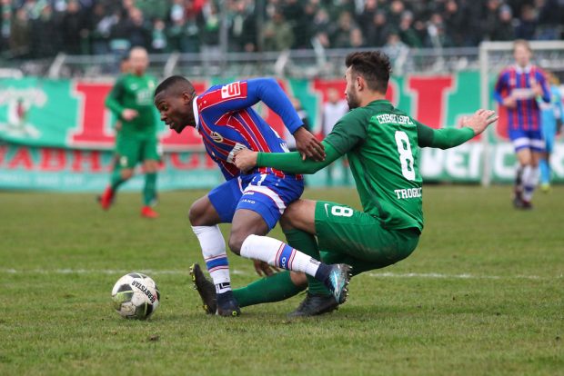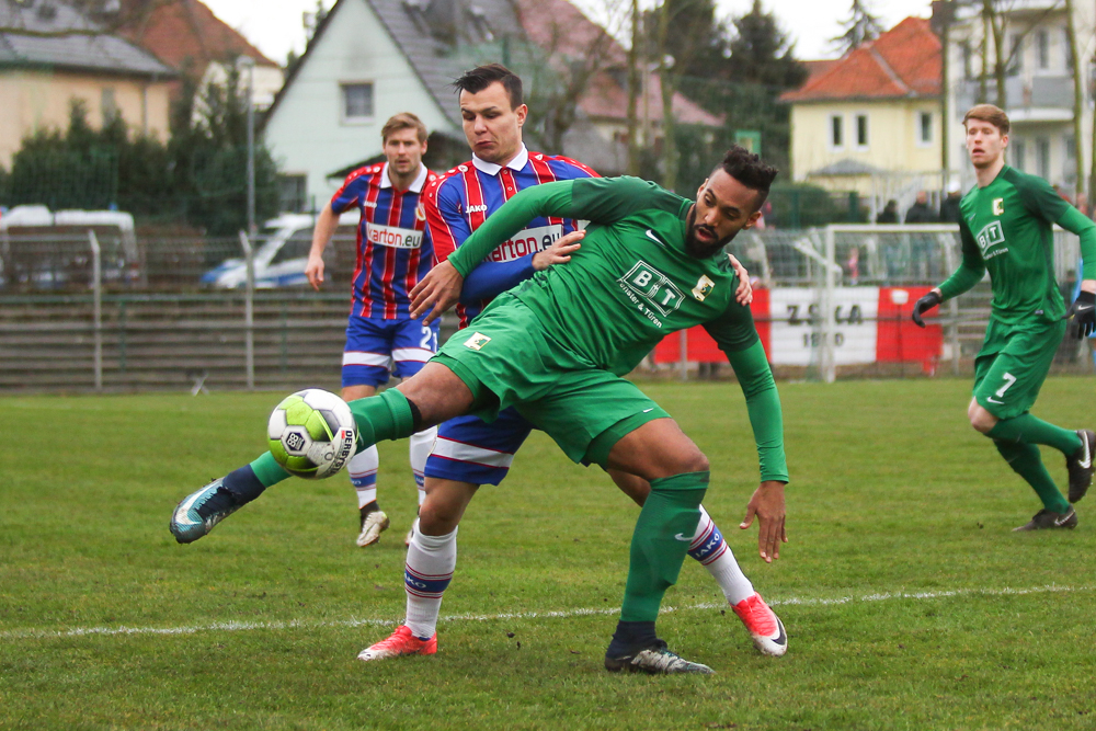 “In der ersten Halbzeit haben wir läuferisch und kämpferisch alles reingehauen”, so Chemie-Trainer Dietmar Demuth. Gegen den Favoriten setzte er mit Alexander Bury und Neuzugang Pierre Merkel auf zwei Spitzen. Torgefahr konnten diese zunächst noch nicht erzeugen. Dafür gelang es den Grün-Weißen, den Gästen die Räume zu verknappen und das Zentrum dicht zu machen.